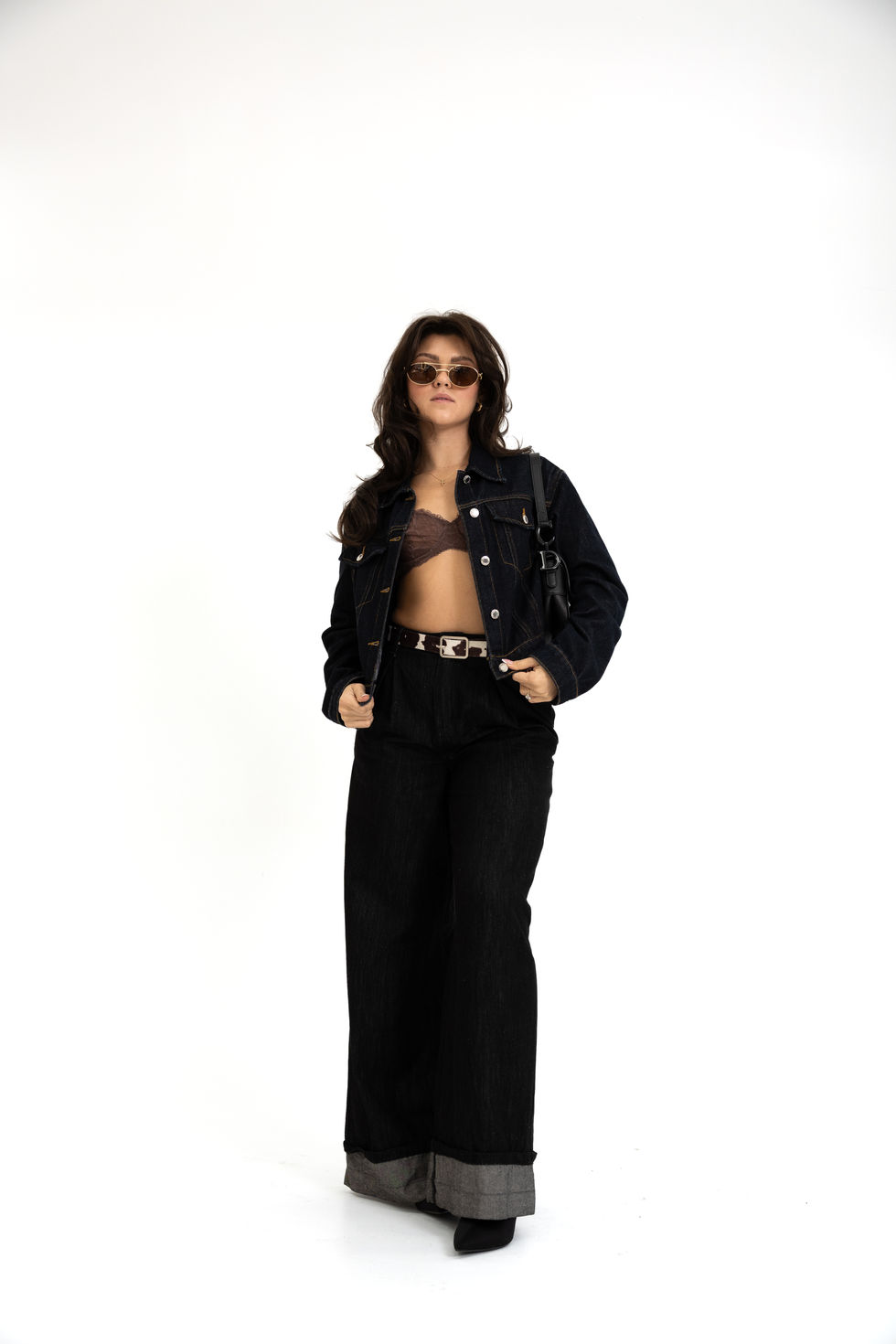 My client requested an all-denim outfit, and I finished it off with a cow-print belt for a unique touch!